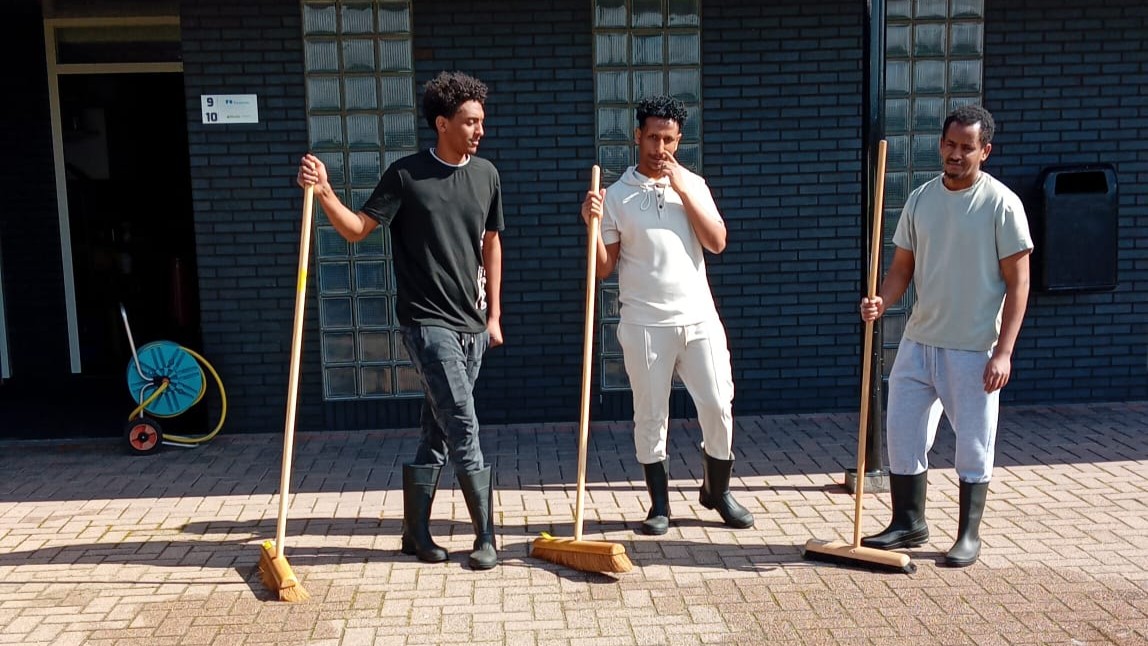 Ook vandaag zijn de jongens er weer en ook nog goedgemutst. Jan Lansink geeft ze allereerst een plak chocolade, omdat ze vorige week bij afwezigheid van Jan ook nog zijn taken hebben overgenomen. Ze waarderen de geste van Jan en voor we tot een gesprek komen, pakken ze al de emmers met heet water en de bezems om aan de slag te gaan. Eerst wordt het jeugdhonk onder handen genomen. Ze stofzuigen, dweilen, poetsen de tafels en stoelen en de toiletgroep. Wat opvalt is dat ze prima samenwerken en de taken goed verdelen. De Nederlandse taal is nog wel een probleem, maar daar wordt hard aan gewerkt. Na de thee is de bestuurskamer aan de beurt. Zo rond de klok van 13.00 uur is de klus geklaard en een boterham gaat er dan wel in. Ze nemen afscheid met de hand op het hart en aanstaande maandag om 14.00 uur komen ze weer terug om dan de kleedkamers, na de wedstrijden in het weekend, schoon te maken.